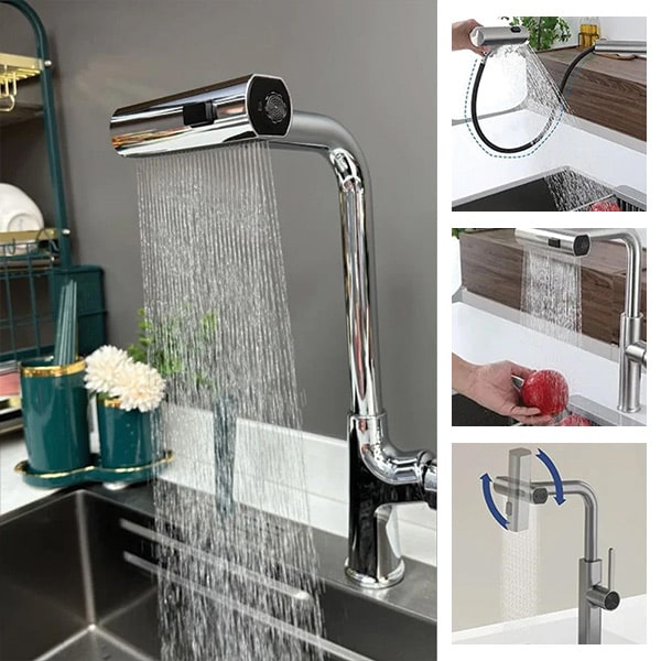 Robinetul nostru multifuncțional de bucătărie include un robinet de apă cu presiune înaltă, rotativ la 360°, care nu numai că elimină stropirea, dar și îmbunătățește fluxul de apă, făcând spălarea și clătirea mai eficiente și mai ușor de gestionat.