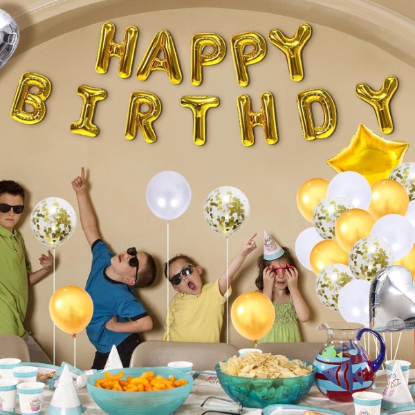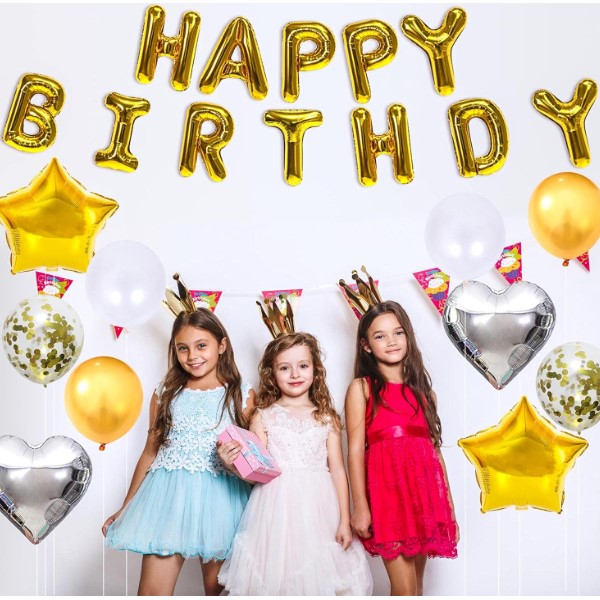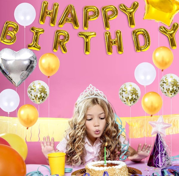 60 de baloane de diferite culori; 1x balon în formă de coroană; 2x baloane în formă de stea cu cinci vârfuri; 2x baloane în formă de stea cu patru vârfuri; 1x cortină din panglici strălucitoare; 1x banner Happy Birthday; 5x set de ciucuri decorativi colorați; 1x decor pentru tort Happy Birthday; Panglică decorativă, accesorii pentru legarea baloanelor, adeziv și bandă de fixare a baloanelor.