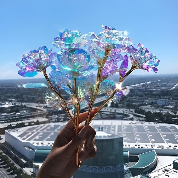 Fiecare trandafir este realizat cu un strat irizat, holografic, care strălucește frumos în lumină, creând o strălucire asemănătoare galaxiei care este pur și simplu hipnotizantă.