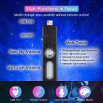 Funcții telecomandă: 18 butoane – pornit/oprit, selecție culoare, luminozitate +/-, breathing, ciclu 7 culori, stroboscop, ambient, stele, reacție la sunet, resetare